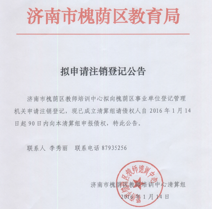 ·关于印发《2017年度济南市槐荫区事业单位绩效考核工作实施方案》的通知 ·槐荫区建筑建材管理处拟申请注销登记公告 ·济南市槐荫区村镇建设服务中心拟申请注销登记公告