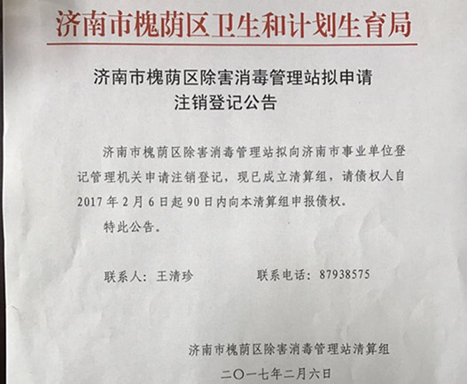 济南市槐荫区除害消毒管理站拟申请注销登记公告